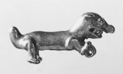 Keywords: Panamanian - Crocodile Pendant - Walters 57302 - Group.jpg Pendants were worn by men around the neck on ceremonial occasions Columbus noted that the inhabitants of Panama who came to greet him wore gold pendants This piece could have been created in Columbus's time or during the previous 600 years The animals represented are often fierce ones with which a warrior would have wanted to associate Two animals are frequently combined creating a mythic creature with composite attributes This crocodile-like pendant has either a double-tongue or more likely a double-headed snake in its mouth The tail is divided in two parts The heads of the snake as well as the claws of the feet are formed of spiral-like attachments The loops for suspension are under the forefeet between 800 1521 Pre-Early Conquest gold and copper alloy cm 6 03 accession number 57 302 36123 Henry Walters Baltimore 1911 mode of acquisition unknown Walters Art Museum Henry Walters Acquired by Henry Walters 1911 place of origin Veraguas-Gran Chiriquà in present-day Panama Walters Art Museum license Pre-Columbian art in the Walters Art Museum Pre-Columbian metalwork of Panama Media contributed by the Walters Art Museum needs category review |