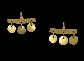 | Keywords: Panamanian - Pair of Earrings with Flat Bar and Three Suspended Discs - Walters 57351, 57352.jpg between 800 1521 Pre-Early Conquest gold alloy cm 3 3 accession number 57 351 57 352 85496 Found at a graveyard between Divalá a village on the outskirts of settled Panama thirty miles west of David in the province of Chiriqui and Costa Rica Spring 1909 Tiffany Co New York 1910 by purchase from Indians see December 29 1910 correspondance from Tiffany Co to Henry Walters Henry Walters city Baltimore Walters Art Museum Henry Walters Acquired by Henry Walters 1911 place of origin Veraguas-Gran Chiriquí in present-day Panama Walters Art Museum license Pre-Columbian art in the Walters Art Museum Jewellery in the Walters Art Museum Pre-Columbian metalwork of Panama Media contributed by the Walters Art Museum needs category review |