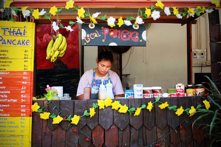 Keywords: pancake sales stand eat food shop assistant sell