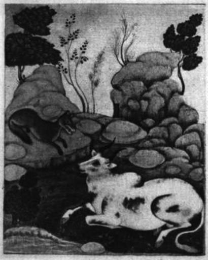 | Keywords: Panchatantra-jackal-bull.png en Illustration of story from Panchatantra The first meeting of the jackal and the bull Damanaka and Sanjivaka One of the Indian designs which adorn the fine Persian MS of the Fables preserved at the British Museum Add MS 18 579 Downloaded from http //books google com/books id nX9bAAAAQAAJ pg PR9 frontispiece of 1888 Jacobs book The earliest English version of the fables of Bidpai The morall philosophie of Doni by Sir Thomas North Edited and induced by Joseph Jacobs 1888 frontispiece executed in 1610 for Tana Sahib the last Rajah of Golconda See Rieu Cat Pers MSS p 756 1610 reproduced in 1888 book PD-old Fables of Bidpai 1888 1610s paintings from India blurry Small images Cows in art of India Illustrations of jackals |