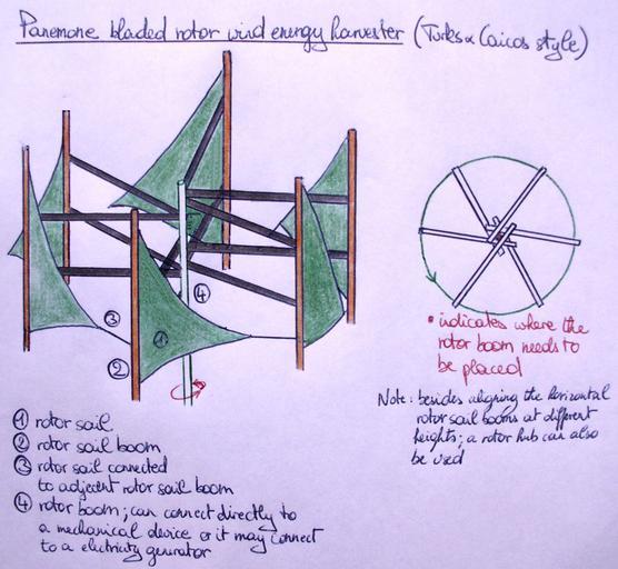 Keywords: Panemone bladed rotor WECS (Turks&Caicos).JPG en A schematic of a Panemone bladed rotor wind energy harvester as commonly built in the Turks Caicos islands The schematic was hand drawn based on an image at http //www fao org/docrep/010/ah810e/AH810E10 htm Own KVDP 2009-09-23 Sustainable development Panemone windmills Micro-generation wind turbines |