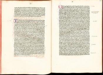 | Keywords: Pannartz Sweynheim Lactantius.jpg  en Spread from De divinis institutionibus by Lactantius printed by Pannartz and Sweynheim in 1465 copy of the Bayerische Staatsbibliothek ru Разво от из «Божественных наставлений» Лактанция  книги напечатанной Панна цем и Свейнхеймом в 1465 году Экземпля из Бава ской госуда ственной библиотеки http //daten digitale-sammlungen de/~db/0002/bsb00029099/images/ Arnold Pannartz and Konrad Sweynheim 1465 PD-old-100 1465 books Subiaco Italy Lucius Caecilius Firmianus Lactantius Conrad Schweinheim Arnold Pannartz |