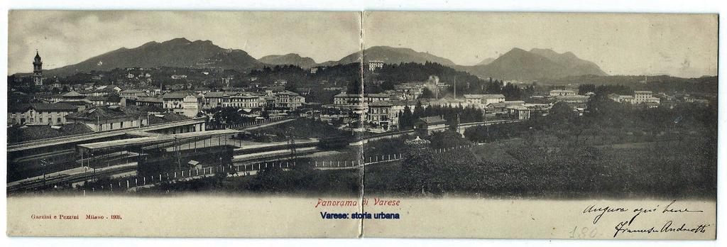 Keywords: varese outdoor Immagine presa da Giubiano: panorama di Varese e di Biumo Inferiore. In basso a sinistra la stazione delle Ferrovie dello Stato (1865), alle sue spalle lo stabilimento della Carrozzeria Macchi e la cupola del Politeama. Più a destra l'imbocco di via Morosini con l'albergo Isola Magenta, al centro l'edificio del Calzaturificio di Varese e si intravede nascosta dagli alberi e da una villetta, la stazione delle Ferrovie Nord Milano (1885). Nella seconda cartolina i Molini Marzoli Massari sovrastati da alte ciminiere fumanti, in secondo piano il campaniletto della chiesa della Madonnina in Prato, più a destra spicca isolato il campanile della chiesa di San Pietro e Paolo. Immagine presa da Giubiano: panorama di Varese e di Biumo Inferiore. In basso a sinistra la stazione delle Ferrovie dello Stato (1865), alle sue spalle lo stabilimento della Carrozzeria Macchi e la cupola del Politeama. Più a destra l'imbocco di via Morosini con l'albergo Isola Magenta, al centro l'edificio del Calzaturificio di Varese e si intravede nascosta dagli alberi e da una villetta, la stazione delle Ferrovie Nord Milano (1885). Nella seconda cartolina i Molini Marzoli Massari sovrastati da alte ciminiere fumanti, in secondo piano il campaniletto della chiesa della Madonnina in Prato, più a destra spicca isolato il campanile della chiesa di San Pietro e Paolo. |