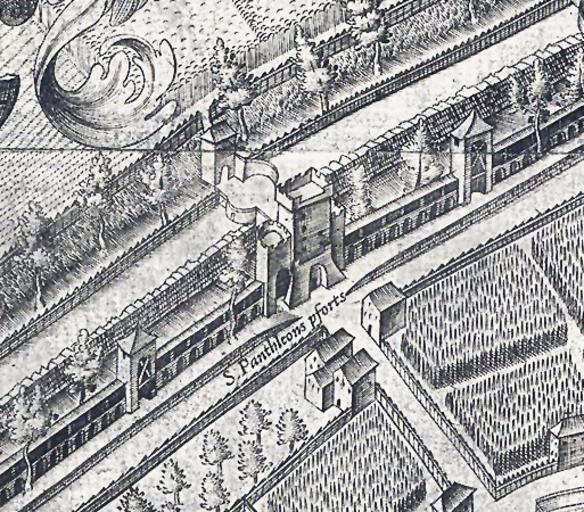 | Keywords: Pantaleonstor-Köln-Mercatorplan-1571.jpg Ausschnitt des Mercator “ Stadtplanes Köln Bereich Pantaleonstor um 1571 Cutout of a old city map 16th century Cologne Scan by HOWI 1571 Creator Arnold Mercator PD-old-100 Kölner Stadtansicht von 1570 Pantaleonstor |