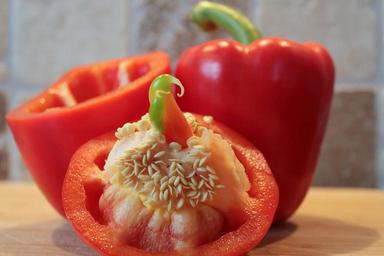Keywords: paprika peppers vegetables food healthy red pepper rich in vitamins vegetarian vitamins vegan seeds white separating skin siel cut in half vitamin c delicious frisch juicy