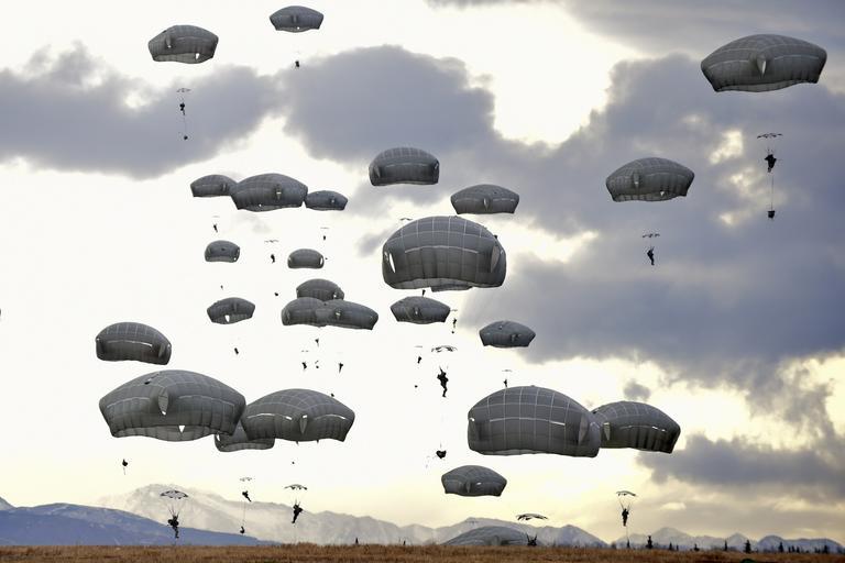Keywords: parachute training parachuting jumping military airborne plane parachutists american sky forces paratroopers floating air canopy jumper