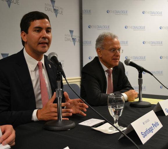 | Keywords: groupshot people indoor Santiago Peña, minister of finance, Carlos Fernández, president of the Central Bank, and Germán Rojas, ambassador to the United States, joined Inter-American Dialogue President Michael Shifter for a conversation on Paraguay’s outlook. Photo by: Ben Raderstorf Santiago Peña, minister of finance, Carlos Fernández, president of the Central Bank, and Germán Rojas, ambassador to the United States, joined Inter-American Dialogue President Michael Shifter for a conversation on Paraguay’s outlook. Photo by: Ben Raderstorf |