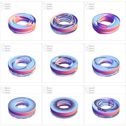 | Keywords: cg 3d parametricplot3d mathematica program プログラム code コード algorithm コード アルゴリズム geometric sculpture geometricsculpture shape geometry sculpture design pattern デザイン パターン graphic グラフィック グラフィクス structure 意匠 構造 symmetry 対称性 たいしょうせい シンメトリー 対称 たいしょう algorithm SetOptions[ParametricPlot3D, MaxRecursion -> 4, Axes -> None, Mesh -> None, Boxed -> False, ImageSize -> 900]; Manipulate[ ParametricPlot3D[{(3 + Cos[v ^ a]) Sin[u], (3 + Cos[v ^ b]) Cos[u], Sin[c v]}, {u, 0, 2 Pi}, {v, 0, 2 Pi}] , {a, 1, 5, 1}, {b, 1, 5, 1}, {c, 1, 5, 1} ] SetOptions[ParametricPlot3D, MaxRecursion -> 4, Axes -> None, Mesh -> None, Boxed -> False, ImageSize -> 900]; Manipulate[ ParametricPlot3D[{(3 + Cos[v ^ a]) Sin[u], (3 + Cos[v ^ b]) Cos[u], Sin[c v]}, {u, 0, 2 Pi}, {v, 0, 2 Pi}] , {a, 1, 5, 1}, {b, 1, 5, 1}, {c, 1, 5, 1} ] |