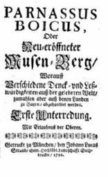 Keywords: Paranssus Boicus 1722.jpg en The bavarian Enlightenment journal Parnassus Boicus first edition from 1722 published in Munich es El periódico bavarés Parnassus Boicus de la época de la ilustración primera edición del año 1722 publicado en Munich bar D'boarische Wissnschåftszaidschrift Parnassus Boicus aus da Zaid fu da Aufklearung easchde Ausgåb aus'n 1722a Joa drukt in Minga full title Parnassus Boicus Oder Neu eröffneter Musen Berg / Worauff Verschiedene Denck und Leß würdigkeiten auß der gelehrten Welt / zumahlen aber auß denen Landen zu Bayrn / abgehandlet werden Erste Unterredung Mit Erlaubnuß der Oberen Gedruckt zu München / bey Johann Lucas Straub / Gem Hochlöbl Landschafft Buchdrucker / 1722 http //www haraldfischerverlag de/hfv/DtZS/parnassus_boicus php Der bayerische Musenberg society of scholars 1722 older than 100 years PD-old-100 Enlightenment philosophy |