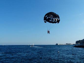 Keywords: parasailing controllable parachuting high parachute fly bird's eye view paragliding hang gliding sky blue paraglider screen sport hobby airy personal human water sports pair sport boat