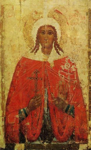 Keywords: Paraskeva (Ryazan, 15 c, Tashkent).jpg en Icon of Paraskeva Razan school ru ПАРАСКЕВА ПЯТ ИЦА XV в Госуда ственный музей искусств Узбекистана Ташкент б/н Де ево паволока левкас темпе а Пе воначально находилась в Успенском собо е Рязанского к емля в XVIII в пе енесена в А хангельский собо Рязанского к емля В 1923 г пе едана в Рязанский к аеведческий музей а в 1938 г в Госуда ственный музей искусств Узбекистана Рестав и ована в 1968 г во ВЦ ИЛКР Рестав ато Е К исти Сох анность акладные шпонки заменены в езными вст ечными доски дополнительно были ск еплены четы ьмя ласточками в настоящее в емя ласточки ут ачены а обо оте деко ативная оспись маслом выполненная в XVIII в на белом фоне в цент е восьмиконечный к ест вок уг него к асные цветы и зеленые листья Поля опилены а лицевой сто оне на п авом поле сох анена запись с ф агментом текста летописи Кинова ные буквы надписи с именем святой и кинова ная обводка нимба сох анились частично Оставлены поздние вставки с записью по стыку досок в цент е иконы слева по конту у плеча в нижней части иконы на изоб ажениях одежд кисти левой уки Па аскевы Во в емя естав ации выполнены незначительные тони овки Выставки Культу а и искусство д евней Руси осква 1969 г Лите ату а Вагне Г К Рязань 1971 с 17 ил 11 Филатов В В Рязанская икона «Па аскева Пятница» Советская а хеология 1971 1 с 173 190 ихайловский Е В Рязань Памятники а хитекту ы и искусства 1985 ил 18 Иллюст ация Вагне Г К Рязань 1971 с 17 ил 11 http //soborn narod ru/art/catalog_1 htm anonimous century 15 Icons of Paraskeva 1400 Icons of Ryazan Files uploaded by Shakko from various sources PD-Art