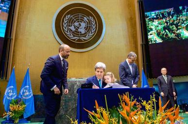 Keywords: secretary kerry secretarykerry united nations unitednations cop21 new york newyork un earth day earthday climate global warming globalwarming "U.S. Secretary of State John Kerry, with his two-year-old granddaughter Isabelle Dobbs-Higginson on his lap and United Nations Secretary-General Ban ki-Moon looking on [on the far right], signs the COP21 Climate Change Agreement on behalf of the United States during a ceremony on Earth Day, April 22, 2016, at the U.N. General Assembly Hall in New York, New York." — U.S. State Department photo 22 April 2016. Public Domain "U.S. Secretary of State John Kerry, with his two-year-old granddaughter Isabelle Dobbs-Higginson on his lap and United Nations Secretary-General Ban ki-Moon looking on [on the far right], signs the COP21 Climate Change Agreement on behalf of the United States during a ceremony on Earth Day, April 22, 2016, at the U.N. General Assembly Hall in New York, New York." — U.S. State Department photo 22 April 2016. Public Domain |