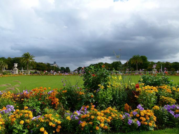 Keywords: paris france jardin du luxembourg flowers grass trees sky clouds nature outside destinations tourism palace summer spring