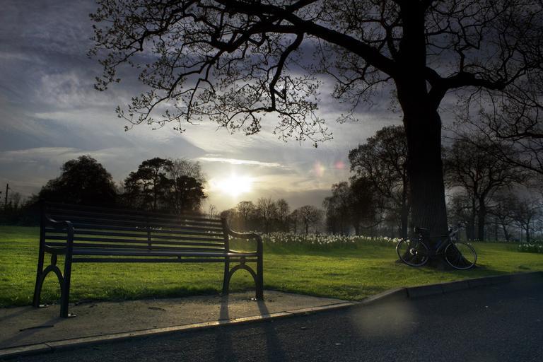 Keywords: park bench golden hour sunlight outdoor nature summer city park
