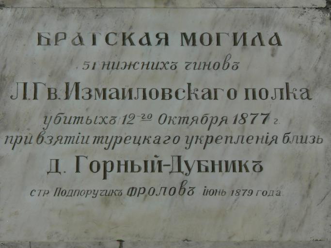 | Keywords: Park-Lavrov-brothers-mound-closeup.JPG  Π Π°Π΄ΠΏΠΈΡ Π½Π° ΠΡ Π°ΡΡΠΊΠ°ΡΠ° ΠΌΠΎΠ³ΠΈΠ»Π° Π² ΠΠ°Ρ ΠΊ ΠΠ°Π²Ρ ΠΎΠ² ΠΊΡ Π°ΠΉ Ρ ΠΠΎΡ Π½ΠΈ ΠΡΠ±Π½ΠΈΠΊ ΠΡΠ»Π³Π°Ρ ΠΈΡ Inscription on The Brothers' Mound in Park Lavrov near village Gorni Dubnik Bulgaria Own 2007-09-08 Vassia Atanassova - Spiritia Park Lavrov 12 October 1877 Cyrillic inscriptions |