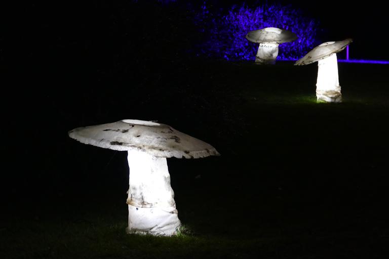 Keywords: park parking lights gruga eat sculpture gruga eat north rhine westphalia tourism evening night darkness dark light lighting light installation fig forest mushroom wood nature
