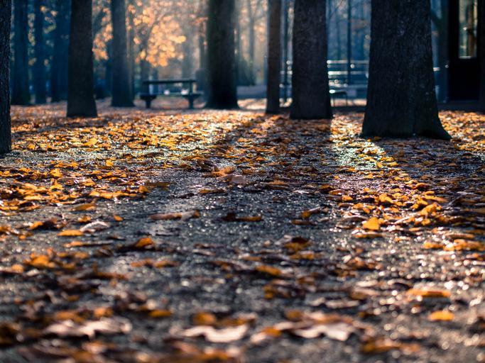 Keywords: park trees shadows autumn fallen leaves foliage colors yellow brown sunlight illumination nature season outdoor fall scene benches ground tranquil