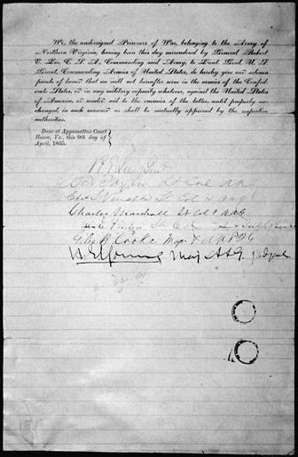 | Keywords: Parole of Confederate General Robert E. Lee and Six of his Staff Officers - NARA - 300387.tif Scope and content By signing this form Robert E Lee and six of his staff officers became paroled prisoners of war and pledged not to take up arms against the United States The surrender formalities lasted 4 days On April 9 1865 Generals Ulysses S Grant and Robert E Lee met in the parlor of a house in Appomattox Court House Virginia to discuss the surrender of the Army of Northern Virginia The terms were generous the men of Lee's army could return home in safety if they pledged to end the fighting and deliver their arms to the Union Army On April 12 1865 in a quiet but emotional ceremony the infantry of Lee's army surrendered their arms folded their battle flags and received their parole papers which guaranteed them safe passage home General notes Exhibit History American Originals December 1996 - December 1997 National Archives Rotunda Washington DC Exhibit No 624 0023 Civil War Centennial 1961- National Archives Washington DC Exhibit No 145 xxxx 300387 Local identifier War Department Record and Pension Office 1892 - 05/11/1904 Archives I Reference Section Textual Archives Services Division NWCT1R National Archives Building 7th and Pennsylvania Avenue NW Washington DC 20408 1865-04-09 Record group Record Group 94 Records of the Adjutant General's Office 1762 - 1984 Record group ARC 423 Document File compiled 1889 - 1904 Series ARC 300385 File unit File unit ARC Variant control numbers NAIL Control Number NWCTB-94-PI17E501-PAROLE<br /> NAIL Control Number NWDT1-94-PI17E501-PAROLE yes Other versions <gallery> File Parole_of_Confederate_General_Robert_E _Lee_and_Six_of_his_Staff_Officers_-_NARA_-_300387 tif tif File Parole_of_Confederate_General_Robert_E _Lee_and_Six_of_his_Staff_Officers_-_NARA_-_300387 jpg jpg </gallery> NARA-cooperation PD-USGov Manuscripts of the American Civil War Robert Edward Lee NARA TIF images with categorized JPGs |