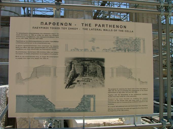 Keywords: Parthenon. Lateral walls of the Cella.JPG Cartel descriptivo de la restauración de los muros de la cella del Partenón Own 2007-08-17 Dorieo21 Parthenon