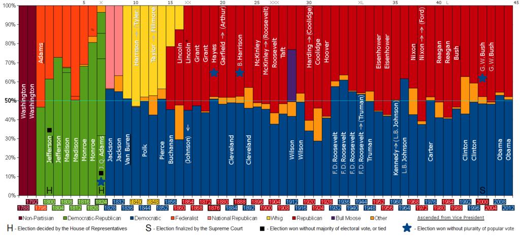 Keywords: PartyVotes-Presidents.png United States presidential elections The boxes which contain the year are colored in according to which party won the presidency that year Criteria for inclusion Party must have either won the presidency or have gotten more than 25 of the popular vote The name of the person who won the election and became president is listed with a gray arrow pointing to the name of a person who became president without having been elected as president 9 total of these transitions happening prior to term completion The double arrow indicates becoming president without having been elected as vice president as well Ford 5 other vice presidents who became president are underlined in black 14 total Of these 14 only 5 were elected directly into the presidency with 2 of these achieving re-election with the other 9 filling a vacancy 8 due to death 1 due to resignation Of these 9 re-election was achieved by 4 Nixon is unique in that he is the only one to become president with a gap after having left the office of Vice President Ford is unique in that he was never elected as either President or vice president This was identified as a factor in him losing his bid for re-election The black squares for the 1800 and 1824 indicate that the presidency was achieved after a tie in the electoral vote in the first case Jefferson and without having a majority of electoral votes in the second case J Q Adams In that 1824 election four candidates from the same party Democratic-Republican were voted on A blue star is shown in four elections 1824 1876 1888 and 2000 These are cases where the presidency was achieved without having a plurality of the popular vote these cases are also indicated with a double thick border around the year of that election The reason why all of these four stars are color-coded blue is because in the latter three cases the party receiving the plurality of popular votes was Democratic and while the 1824 case had Andrew Jackson in the Democratic-Republican Party receiving the plurality of votes this event led to the creation of the Democratic Party in which Jackson won the presidency in the very next election 1828 The letter 'H' indicates that the election was decided by the House of Representatives Jefferson J Q Adams and the letter 'S' indicates that the election was finalized by the Supreme Court G W Bush While the process of a presidential election being decided by the House is specifically enumerated by the Constitution there is no such power given to the Supreme Court The Supreme Court has no authority per se to decide a presidential election Its finalization of Bush was a result of their Constitutional authority to rule over a court case Bush v Gore and it is only because the election was so close with a margin of victory of hundreds of votes in a state where almost 6 million votes were cast that the ruling of 9 justices had the de facto effect of Bush being elected as president And since their decision had a 5-4 split it made for the extremely improbable case where any single justice who voted in the majority had the power to swing the ruling so this decision on whether Bush would win the election rested on a single person The asterisk next to Lincoln's name in 1864 is because for that wartime election the Republican Party chose to call themselves the National Union Party The 'Ø' symbol in 1820 indicates that there was no Federalist candidate that ran against Monroe but still got more than 16 of the popular vote This graph starts at 1788 and does not address the persons who performed the presidential roles including Head of State Executive in Chief and Commander in Chief under previous governments of the United States of America under the Articles of Confederation and prior to the 1781 ratification of that first written constitution for the country The top line of this graph has Roman numerals to indicate the election number also term number and the presidency numbers are shown as well eg Reagan-40th President <br>right 150px File Combined--Control of the U S House of Representatives - Control of the U S Senate png To see the control of the Executive Branch graphed in context with control of the House and Senate see File Combined--Control of the U S House of Representatives - Control of the U S Senate png <br><br><br>right 150px File US Presidents Map of Oaths and Exits png For a map that shows where the nine pre-term completion vice-president transitions took place see File US Presidents Map of Oaths and Exits png Data from 1788 to 1820 from http //www ourcampaigns com/ <br> Data from 1824 to 2008 from http //www uselectionatlas org/ <br> Data from 2012 from various news sources 2013-11-08 12 08 00 File PartyVotes png ChrisnHouston 120px File PartyVotes-PresidentsWhoHadBeenVicePresidents png - Same graph but highlighted to show Vice Presidents who became President<br/> 120px File PartyVotes png - Original without text<br/> 120px File US Presidential Elections by Popular Vote he svg - Reversed in Hebrew cc-zero Graphs of political parties in the United States United States presidential election statistics Presidents of the United States |
