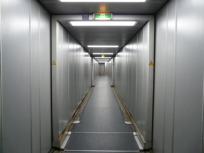 Keywords: passenger boarding bridge gangway access bridge increased to aircraft airport access climb leave passenger zustieg closed covered gang tunnel metal lighting neon lights