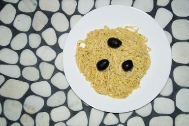 Keywords: pasta olives plate mosaic river rock white black caulk stone tile natural rocks food
