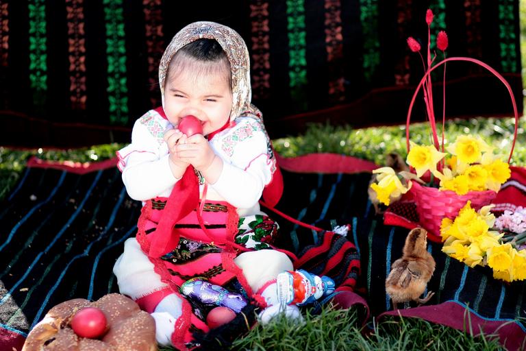 Keywords: pasta toddler girl egg traditional costume green flowers grass