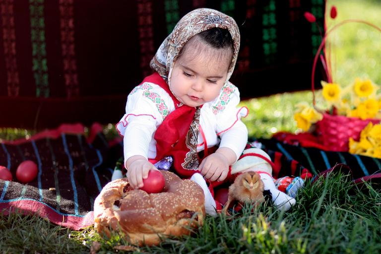 Keywords: pasta toddler girl egg traditional costume green flowers grass