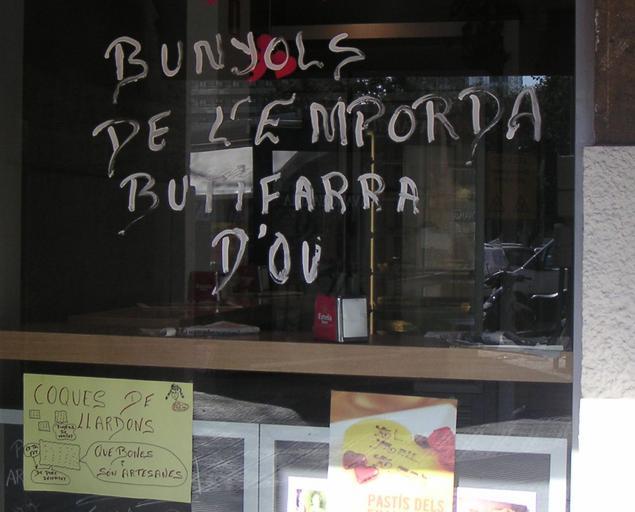| Keywords: Pastisseria a Carnaval.jpg ca Aparador d'una pastisseria de Barcelona al Carnaval anunciant que té botifarra d'ou i coques de llardons Ja tenen també bunyols de Quaresma Own Slastic 2010 Carnaval de Barcelona Botifarra Coques Sweet food of Catalonia Cake shops in Barcelona Shop windows in Catalonia January 2003 in Barcelona |