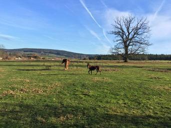 Keywords: pasture coupling horse graze eat donkey tree sky