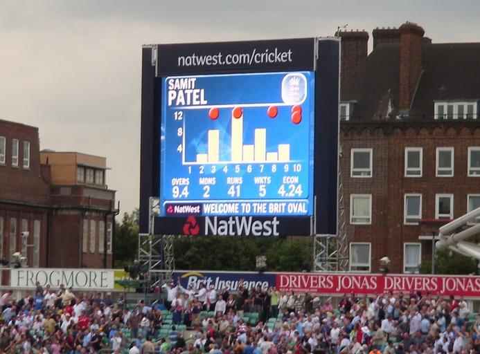 Keywords: Patel scoreboard.JPG en The big screen at The Oval records Samit Patel's Manof the Match winning bowling Own PaddyBriggs 2008-08-29 Cricketers