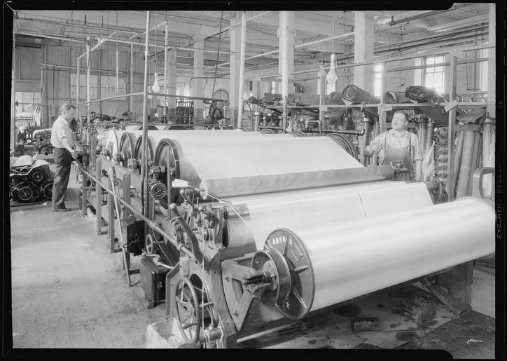 Keywords: Paterson, New Jersey - Textiles. Jackson Winding and Warping Company - NARA - 518768.tif Scope and content Paterson New Jersey - Textiles Jackson Winding and Warping Company Picture of a Charles B Johnson Sizing Machine This is the latest High Speed Sizing Machine and is known as a Seven Can Type The cloth goes through this machine at the rate of 80 yards a minute and can do a 1 200 yard warp in about 45 minutes This estimate of time includes the tying up and removing of the warp These sizing machines come with a different number of cans The Five Can Type can do about 35 yards a minute and completes the warp in approximately an hour The Three and Two Can Types do about 22 yards a minute and complete a warp is about 1-1/4 to 1-1/2 hours Regardless of the number of cans involved in a particular machine the sizing requires 2 operators on the machine in use General notes 518768 Local identifier 69-RP-709 Federal Works Agency Work Projects Administration National Research Project ca 1941 - ca 1942 NARA-Author Hine Lewis Wickes 1874-1940 Photographer 1122914 <br /> Paterson Passaic New Jersey United States North and Central America inhabited place 4202736 40 917 -74 167 <br /> Still Picture Records Section Special Media Archives Services Division NWCS-S National Archives at College Park 8601 Adelphi Road College Park MD 20740-6001 06/1937 Record group Record Group 69 Records of the Work Projects Administration 1922 - 1944 Record group ARC 398 Lewis Hine Photographs for the National Research Project compiled 1936 - 1937 Series ARC 518291 File unit File unit ARC Variant control numbers NAIL Control Number NWDNS-69-RP-709 yes Other versions <gallery> File Paterson _New_Jersey_-_Textiles _Jackson_Winding_and_Warping_Company_-_NARA_-_518768 tif tif File Paterson _New_Jersey_-_Textiles _Jackson_Winding_and_Warping_Company_-_NARA_-_518768 jpg jpg </gallery> NARA-cooperation PD-USGov Sizing machines Paterson New Jersey-Textiles NARA TIF images with categorized JPGs |
