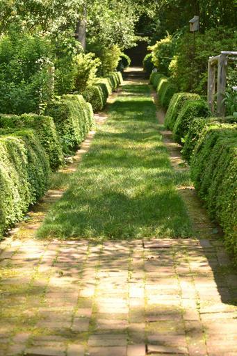 Keywords: path garden stone pathway green landscape hedges brick pavers foliage scenic walk walkway park summer spring