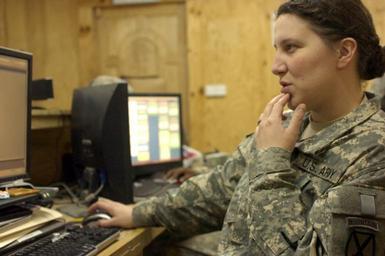 Keywords: Patriot Support Soldiers pick up stakes, move to Forward Operating Base Hammer DVIDS134938.jpg en Capt Angela Sands a battalion operations officer from Fort Polk La assigned to Headquarters and Headquarters Company 94th Brigade Support Battalion 4th Brigade Combat Team 10th Mountain Division Multi-National Division “ Baghdad enters data into her computer Dec 2 Sands keeps things running smoothly on Forward Operating Base Hammer and provides operational focus in the Tactical Operations Center 2008-12-02 Staff Sgt Jeremy Todd https //www dvidshub net/image/134938 134938 2008-12-10 08 13 RUSTAMIYAH IQ PD-USGov Fort Polk Images from DoD uploaded by Fæ |