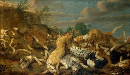 | Keywords: Paul de Vos - The Leopard Hunt - WGA25326.jpg s 1630 Oil on canvas size cm 201 344 Institution Hermitage Museum object history credit line accession number WGA link 25326 http //www wga hu/art/v/vos/paul/leophunt jpg http //www wga hu/html/v/vos/paul/leophunt html PD-old-100 painting landscape Flemish 1601-1650 Paintings by Paul de Vos in the Hermitage Animalist paintings in the Hermitage 1630s paintings in Russia WGA form painting WGA type landscape WGA School Flemish WGA time period 1601-1650 Jan Wildens 17th-century paintings of animals Paintings by two artists 17th-century paintings in the Hermitage |