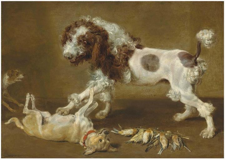 | Keywords: Paul de Vos - Three dogs playing, with songbirds on the floor.jpg Artwork Creator Paul de Vos en Three dogs playing with songbirds on the floor 1604-1679 http //www christies com/lotfinder/paintings/paul-de-vos-three-dogs-playing-with-5868296-details aspx from searchresults intObjectID 5868296 sid 3e162bd4-0d7b-42e1-b932-21e910b9519d Oil canvas size cm 86 121 2 object history credit line Sold at Christie's on 28 January 2015 in New York lot 7 accession number PD-old-100 PD-old-100 Paul de Vos 17th-century oil on canvas paintings 17th-century paintings of dogs |