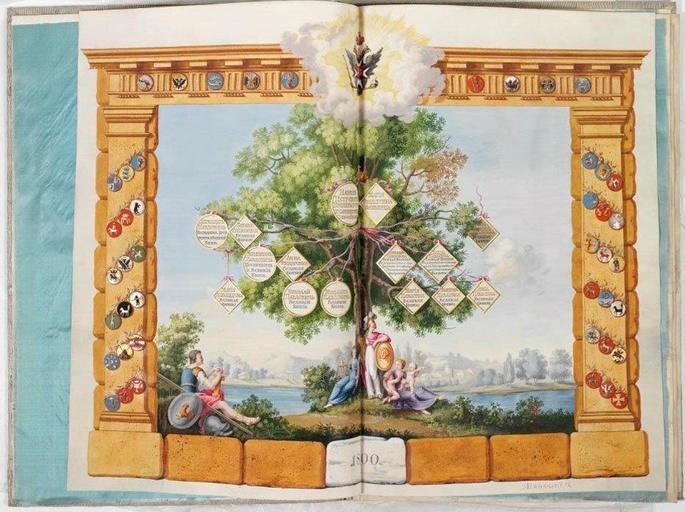 | Keywords: Paul I of Russia's family tree (1800).jpg ЛИСТ С ИЗОБРАЖЕ ИЕ ГЕ ЕАЛОГИЧЕСКОГО ДРЕВА И ПЕРАТОРА ПАВЛА I из Родословной книги оссийской импе ато ской фамилии Санкт-Пете бу г 1800 Пе гамент бумага; тушь аква ель гуашь тво еные золото и се еб о; пе еплет - ка тон глазет ба хат шелк золотные се еб яные и шелковые нити блестки; ткачество шитье Книга поступила из дво цового имущества в 1922 г Рестав ация 2006 г Рестав ато Т Г Па фёнова http //www kreml ru/exhibitions/moscow-kremlin-exhibitions/iskusstvo-sokhranyat-iskusstvo-restavratsiya-v-muzeyakh-moskovskogo-kremlya/ 1800 RusPainter Files uploaded by Shakko from various sources Books in the Museums of Moscow Kremlin Paul I of Russia Family trees of Russian rulers in art PD-old-100 |