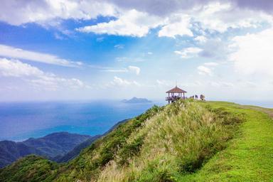 Keywords: pavillon coastal above sea ocean shore distant island horizon summer view lookout nature hill people persons enjoying