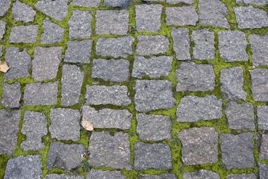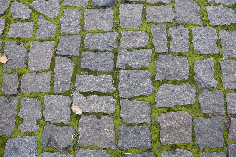 Keywords: paving stones grass moss stones ground away repetition green pattern grey square road cobblestones grey joints downtown plant