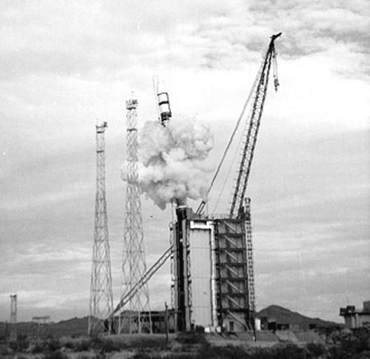 Keywords: Peacekeeper - simulated missile and canister test 2 2.jpg en The mock MX missile starts its ascent 796 Federal Government of the United States PD-USGov LGM-118 Peacekeeper Jackass Flats