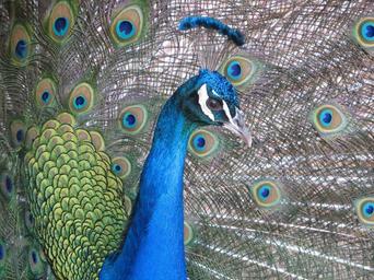 Keywords: peacock close up plumage bird head tail peafowl fantail vibrant exotic tropical feathers green colorful wildlife turquoise natural fowl plume pattern