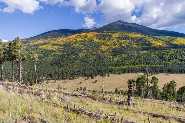 Keywords: arizona coconino national forest coconinonationalforest flagstaff ranger district flagstaffrangerdistrict forest service forestservice national forest nationalforest san francisco mountain sanfranciscomountain san francisco peaks sanfranciscopeaks u.s. forest service usforestservice usfs white horse hills whitehorsehills aspen autumn fall fall color fallcolor fall colors fallcolors fall foliage fallfoliage flagstaff forest hiking mountain outdoors peaks united states unitedstates outdoor landscape hill foothill grassland field mountainside Fall color on the San Francisco Peaks, viewed from the White Horse Hills along Forest Road 418, October 1, 2016. This drive takes you all the way around Arizona's highest mountain, winding through a land of pine forests and aspen groves, open prairies and rustic homesteads. Autumn turns the mountain to gold, filling forest roads and trails with visitors come to enjoy the colorful display. Because the road becomes very rough and rocky between Bear Jaw and Abineau canyons, a mid to high clearance vehicle is required to complete the loop. However, fall color can be seen on either end of the road accessible to low clearance passenger cars. There are a number of places along this route where you can stop to take a hike, enjoy a lunch or even set up a primitive camp. That way you can take more than one day to do this drive or combine it with one or more of the other scenic drives in the vicinity of the San Francisco Peaks. The White Horse Hills are northwest of the Abineau-Bear Jaw Trailhead entrance on the north side of the road. There are no system trails into the hills, but there is an old two-track leading into valley between the hills that is easy to follow on foot. Photo by Deborah Lee Soltesz, October 1, 2016. Source: U.S. Forest Service, Coconino National Forest. See Around the Peaks Loop Scenic Drive for information about this drive on the Coconino National Forest website. Fall color on the San Francisco Peaks, viewed from the White Horse Hills along Forest Road 418, October 1, 2016. This drive takes you all the way around Arizona's highest mountain, winding through a land of pine forests and aspen groves, open prairies and rustic homesteads. Autumn turns the mountain to gold, filling forest roads and trails with visitors come to enjoy the colorful display. Because the road becomes very rough and rocky between Bear Jaw and Abineau canyons, a mid to high clearance vehicle is required to complete the loop. However, fall color can be seen on either end of the road accessible to low clearance passenger cars. There are a number of places along this route where you can stop to take a hike, enjoy a lunch or even set up a primitive camp. That way you can take more than one day to do this drive or combine it with one or more of the other scenic drives in the vicinity of the San Francisco Peaks. The White Horse Hills are northwest of the Abineau-Bear Jaw Trailhead entrance on the north side of the road. There are no system trails into the hills, but there is an old two-track leading into valley between the hills that is easy to follow on foot. Photo by Deborah Lee Soltesz, October 1, 2016. Source: U.S. Forest Service, Coconino National Forest. See Around the Peaks Loop Scenic Drive for information about this drive on the Coconino National Forest website. |