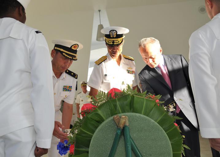 Keywords: Pearl Harbor Ceremony 130906-N-IT566-168.jpg en From left to right Rear Adm Wei Gang chief of staff for North Sea Fleet Adm Cecil D Haney commander of U S Pacific Fleet and China's ambassador to the United States Cui Tiankai lay a wreath at the USS Arizona Memorial during a tour of historic Pearl Harbor sites Haney hosted Ambassador Cui and his delegation in conjunction with the ongoing port visit to Pearl Harbor by three Chinese navy ships Engagements such as this offer the U S Navy an opportunity to build a positive and constructive relationship with the Chinese Navy while encouraging multilateral cooperation enhancing transparency and mitigating risk U S Navy Photo by Mass Communication Specialist 2nd Class David Kolmel/Released 2013-09-07 Petty Officer 2nd Class David Kolmel https //www dvidshub net/image/1012003 130906-N-IT566-168 2013-09-07 01 33 JOINT BASE PEARL HARBOR-HICKAM HI US PD-USGov-Military-Navy 2013 in Pearl Harbor People at Pearl Harbor USS Arizona Memorial interior Images from DoD uploaded by Fæ |