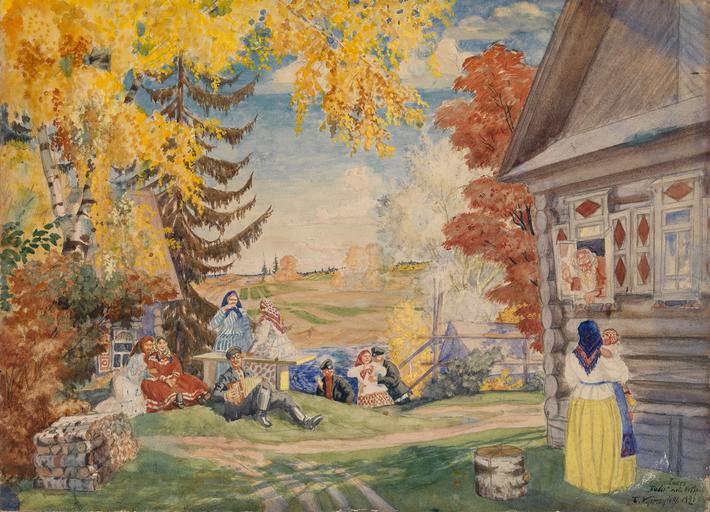 | Keywords: Peasant Women (Neverov) by Kustodiev (1920, priv.coll) 01.jpg Set Design for Alexander Neverov's Peasant Women signed inscribed in Cyrillic I akt/ Baby p'esa Neverova and dated 1920 Pencil and watercolour on paper laid on cardboard 44 5 by 62 cm 70 000-90 000 GBP Provenance Private collection UK Authenticity of the work has been confirmed by the expert V Petrov It is no surprise that Boris Kustodiev who worked so enthusiastically on the themes of traditional Russian life festivals and holidays should have collaborated closely with the theatre This set design for Alexander Neverov ™s play Peasant Women which had won acclaim in Moscow in 1920 conveys the atmosphere of an autumnal Sunday in the country with the vivid colours typical of Kustodiev In this populous composition which was created for a production at the Smolny Theatre in Petrograd the artist reproduced the typical Russian characters so recognisable from his genre paintings Close to the style of lubok folk art and craft work which Kustodiev studied and was so fond of this watercolour reveals to us the character of a Russian village conveying the essence of ordinary people ™s everyday life in the multi-coloured language of art Kustodiev himself said I regard a vivid kaleidoscope of colours to be entirely characteristic of Russian life His palette holds great significance in his works and becomes particularly saturated in his theatre designs with their generalised schematic forms This rare design for Peasant Women a poetic image of Russian provincial life clearly testifies to Kustodiev ™s talent as a theatre designer http //macdougallauction com/Indexx1211 asp id 67 lx a 1920 Kustodiev Scenic designs by Boris Kustodiev Files uploaded by Shakko from various sources MacDougall's Fine Art Auctions PD-old Alexandr Neverov |