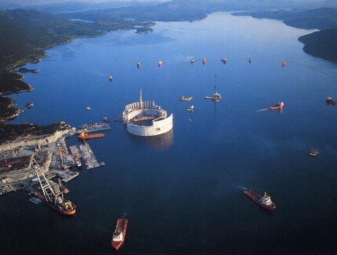 Keywords: Pecon1.jpg Picture of the building of Ekofisk wall in Vikebygd Norway in 1988/89 Own picture 2006-05-04 own assumed Aloba Vindafjord Petroleum production of Norway Fjords of Hordaland Ekofisk