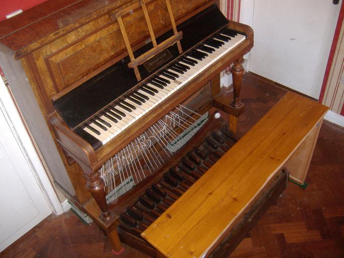 Keywords: Pedal Piano 2.JPG An upright piano with pedal board The pedals are connected by string to the lower octaves of the piano keyboard so the bass notes can be played with the feet like on an organ 2007-04-05 own assumed Clavecin~commonswiki Pedal pianos