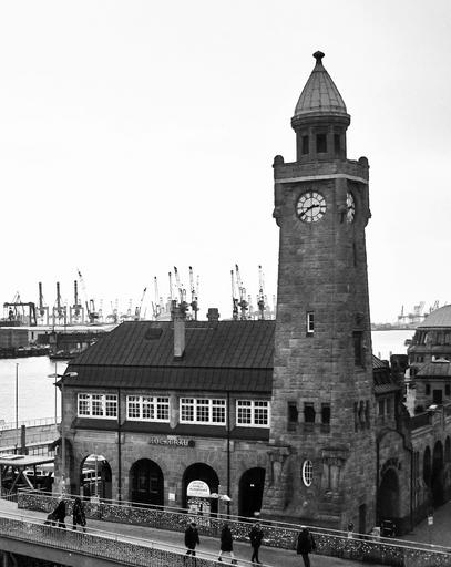 | Keywords: pegelturm landungsbrücken port of hamburg black and white port hanseatic hamburgisch historically hanseatic city hamburg landungsbrücken elbe architecture hamburg port harbour cranes hamburg tourist attraction port city places of interest northern germany known st pauli piers clock tower bell tower |