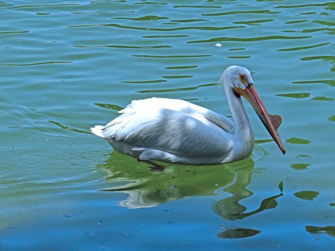 MAKE A MEME View Large Image pelicans swimming water birds white feathers long beak large throat pouch bright day blue green lake pond waves swims wildlife single alone isolated nature fauna reflections