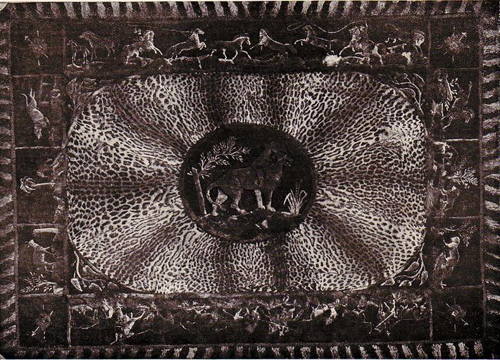 | Keywords: Pelz-Wandteppich.jpg Bildunterschrift Wandteppich für Jagd oder Sportzimmer Fot Repr 1/15 nat Größe 14 7 x 10 2 cm Ausgeführt von der Firma BODE Dresden Die Mitte ziert ein aus gerupfter nat Otter geschnittener Löwe Das žFeld ist mit schöngefleckten Tigerkatzen offensichtlich jedoch Ozelots ausgefüllt deren gelbschwarze Tönung vorteilhaft mit der Färbung der Mosaik harmoniert Am kunstvollsten ist die Umrahmung gehalten Die obere Partie zeigt das Einfangen von Pferden mit Lassos; die rechte Seite ein Zebra Löwin und Löwe und einen Fuchs Die untere Partie eine Büffeljagd die linke Seite ein Reh Elephanten und einen Hund Die 4 Ecken endlich zeigen Schilder und Jagdwaffen Sämmtliche Figuren sind aus nat Otter geschnitten und teils in den Grund eingenäht teils aufgesetzt Paul Larisch / Josef Schmid; Das Kürschner-Handwerk Paris 1 Jahrgang No 12 Juni 1903 S 72 Verlag von Paul Larisch und Josef Schmid Faubourg St Martin own possession 2008-01-13 Firma Bode Dresden für die Kürschnerarbeit photographer unknown PD-old Fur carpets Mosaics of animals Das Kürschner-Handwerk Paul Larisch und Joseph Schmid II S 69 Ocelot fur-skins Otter fur-skins Lions in decorative arts Horses in art Zebras in art Furriers in Dresden Bode Rugs and carpets of Germany Carpet mosaics Fur mosaics Die Pelzmosaik - La Mosaïque en Fourrures - The Fur Mosaic P Pellifex 40 |