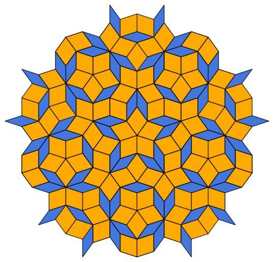 Keywords: PenroseTilingFilled4.svg en 4th iteration of L-system of Penrose tiling cs 4 iterace L-systému Penroseova dláždění own NightElfik Generated with <pre>PenroseTilingFilled axiom + 18 N++N++N++N++N; angle 36; palette 000 47d fa0; polyReverse 1; lateLinesDraw 1; step 32; i 4; margin 16; M > O++ 1 P ----N -O ----M ++; N > + 2 O --P ---M --N +; O > - 2 M ++N +++O ++P -; P > -- 1 O ++++M +P ++++N --N; </pre> L-Systems Penrose tilings Files by User NightElfik 5-fold rotational symmetry Geometry images with dihedral symmetry 05 Order 4